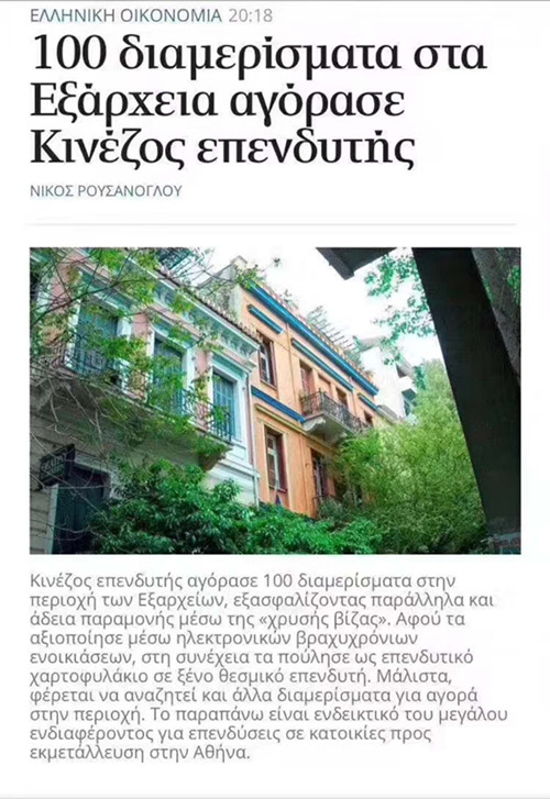 Greek National Pride的壹篇報道引起了不小的轟動,報道指出:壹名中國投資者壹次性買下希臘雅典Exarchia地區100套公寓。