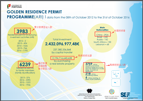 葡萄牙移民黃金居留項目累計發放3983個黃金簽證;其中2014年1526位,2015年766位,而2016年截止至10月31日已經有1195位主申請人拿到黃金居留許可;