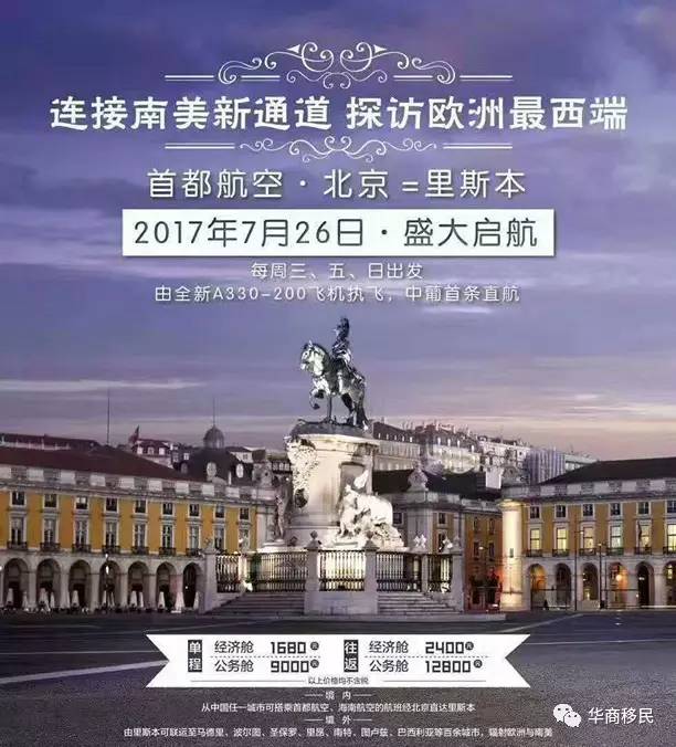 【葡萄牙移民】【4月17日首都航空正式對外發布,中葡兩國間第壹條直飛航線“北京=裡斯本”将于7月26日正式啟航。乘坐全新的空客雙通道寬體機A330-200,僅需13個小時,您就可以壹覽特茹河畔的秀美風景,感受這個質樸卻又魅力無窮的國家。每周三次航班,分别于每周三、五、日于北京和裡斯本雙向對飛,往返最低2400元起(不含稅)。