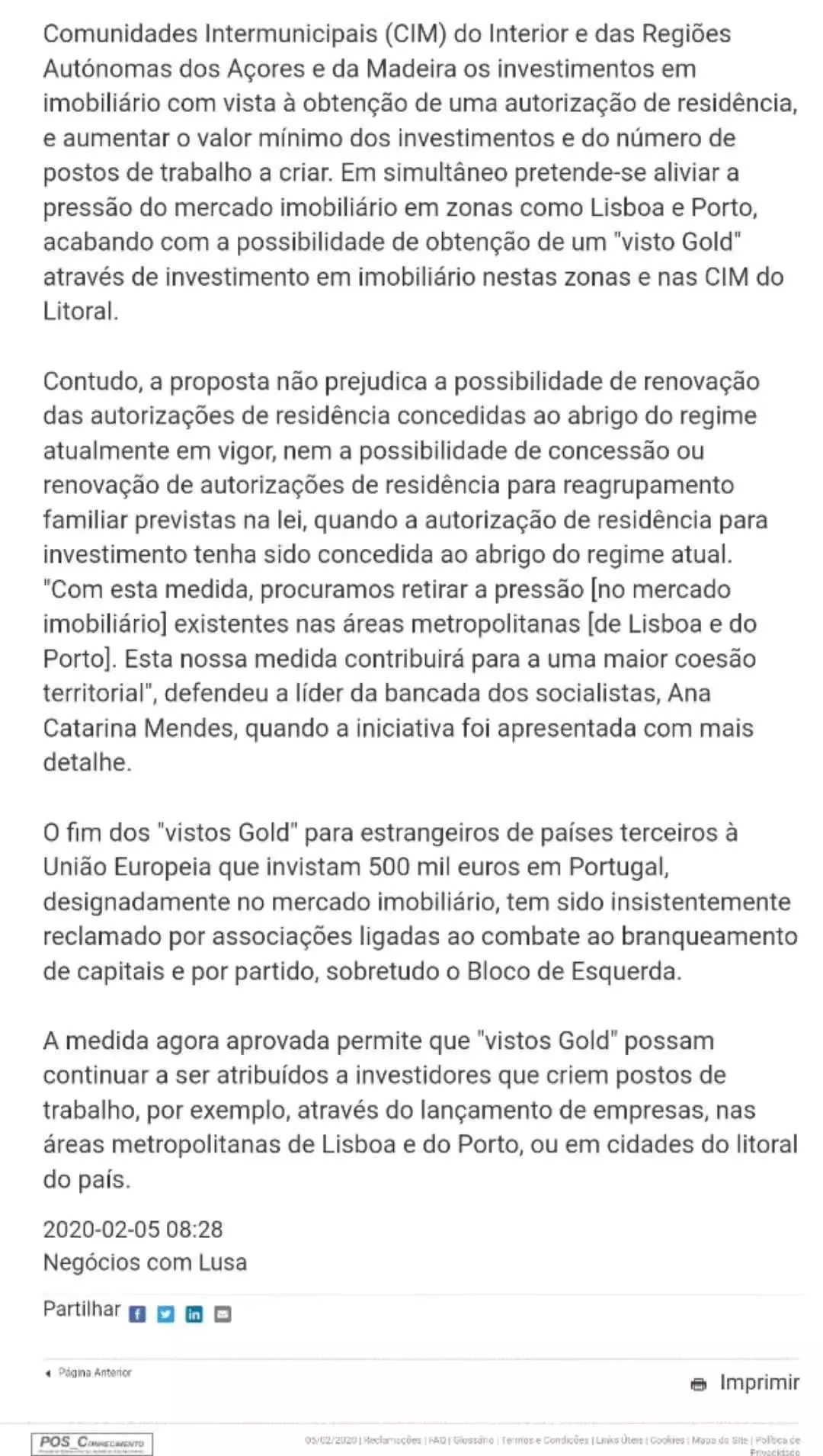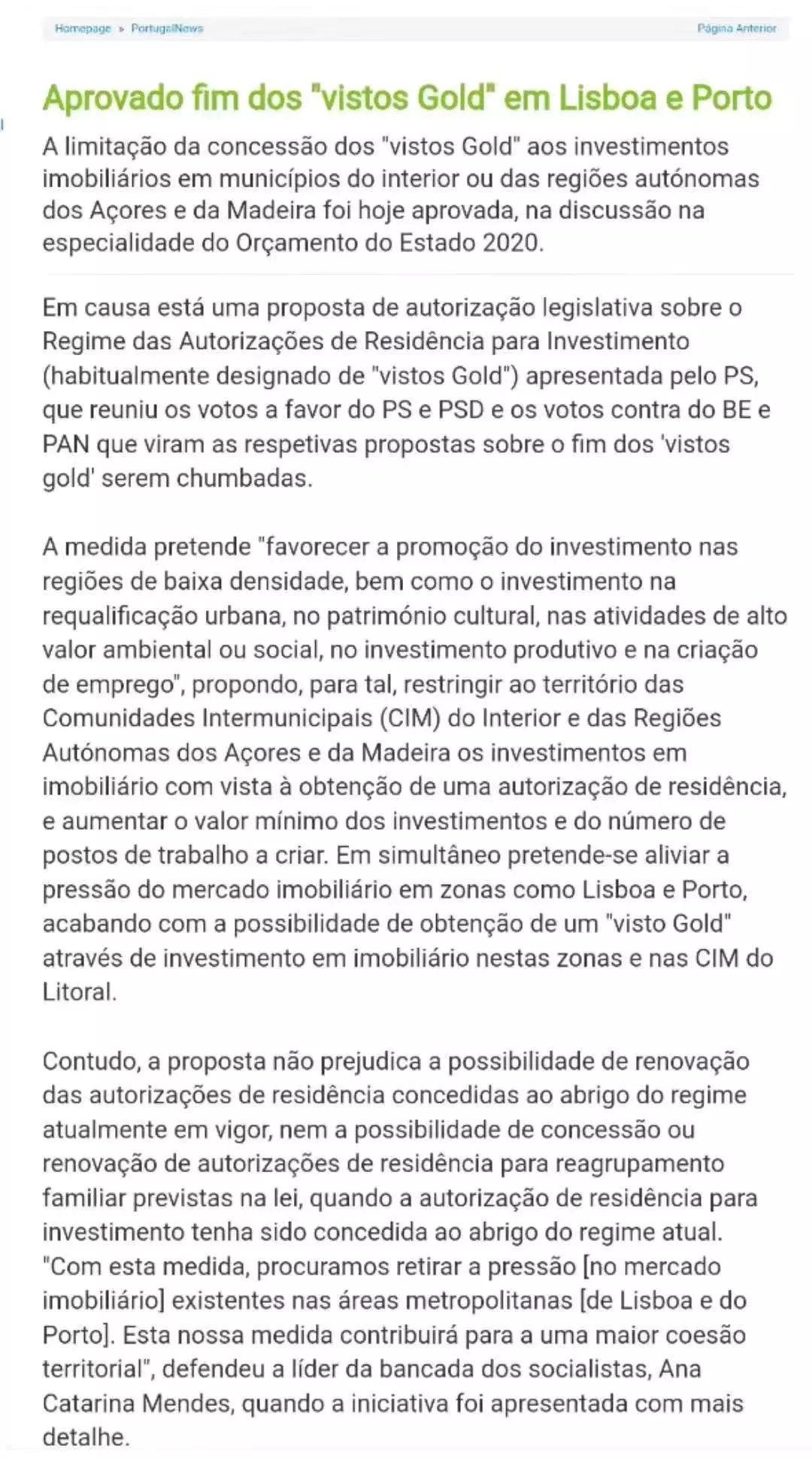 1月27日,葡萄牙社會黨(PS)起草法案,提議結束裡斯本和波爾圖的黃金簽證房地産投資,将黃金簽證限制在内陸地區和自治區。