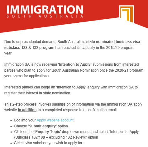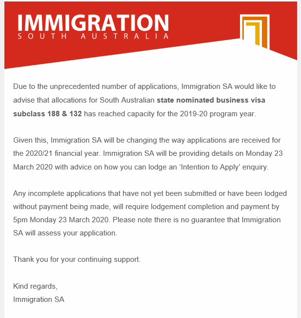 繼昆州、新州、首都領地的投資移民名額耗盡之後,南澳政府宣布本财年188類和132類投資移民配額也已經用完了,現已關閉申請,2020年7月1日重開。