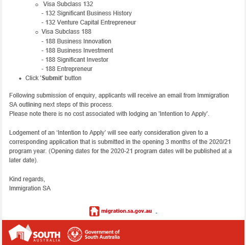 如在2020-21财政年度申請南澳州的商業移民提名,可以開始通過該通道向南澳州移民局提交“申請意向”,以便南澳州移民局了解并收集申請人的信息及數量。