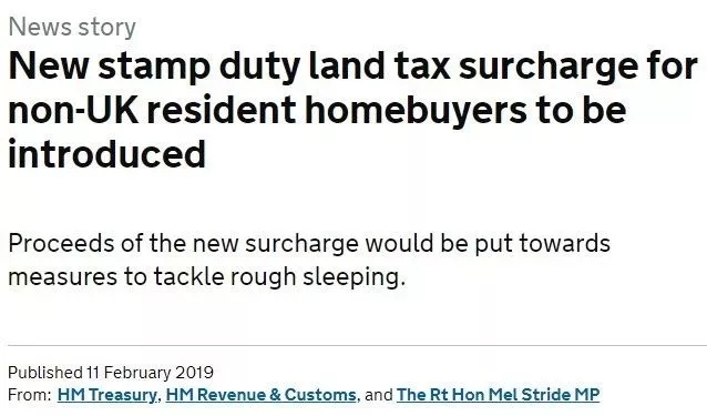 2019年2月11日晚間,英國稅務局HMRC公布“海外買家稅”征稅草案,将面向海外買家多征收1%的印花稅,目前已經正式開啟公衆咨詢。