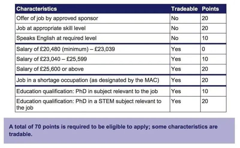 根據英國政府目前公布的打分表來看,打分項分為強制性和非強制性2部分,總分達到70分才能申請工簽。