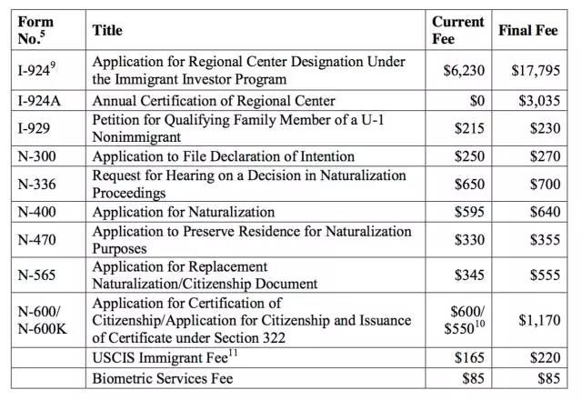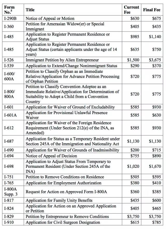 下面是國土安全部公布的移民申請費調整表: