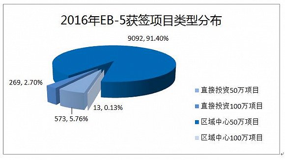 根據2016财年數據,842張EB-5簽證發給了EB-5直接投資類别(Direct Investment)的投資者。其中,269例為100萬美元的投資,573例為50萬美元的投資(目标就業區域TEA項目)。直接投資申請的數量較2015财年,增加了400%。這種成倍的增長表明,市場對區域中心法案的改革和延期存在較大的擔憂,當然從全部數據看直接投資申請依然僅占有8.5%的比例,區域中心項目占比依舊高達91.5%。