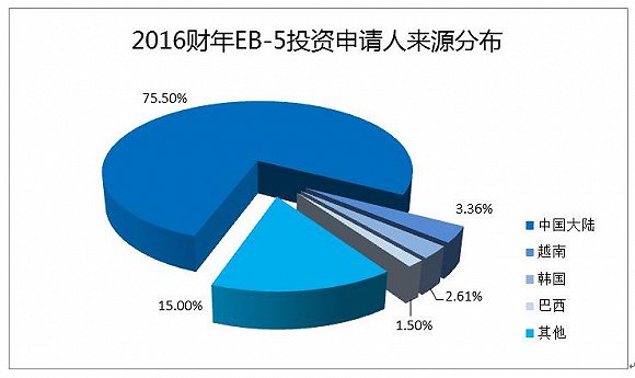 從EB-5項目申請人來源國看,巴西意外的取代印度而進入了全球5大EB-5申請來源國行列。而中國以75.5%仍然位居第壹大EB-5申請國,隻是已經比2015财年下降了7.5%。這樣的變化,足以說明EB-5投資移民項目在全球範圍内的影響依然在繼續擴大。