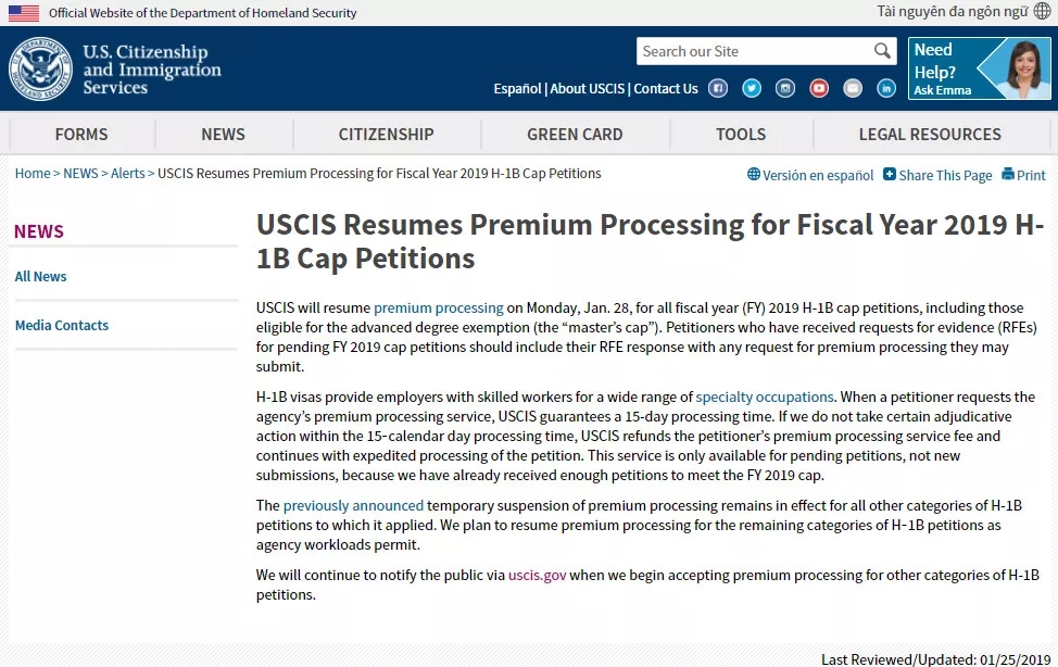 美國移民局(USCIS)星期五宣布,将從1月28日起恢複對所有2019财年H-1B申請的加急處理服務,其中包括符合高級學位豁免條件的申請。