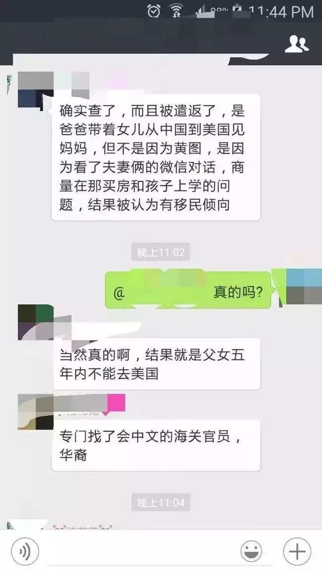 壹位網民講述他被遣返的過程,入境時他略顯不耐煩,于是被請進"小黑屋",然後海關拿出他的手機進行檢查,在微信裡查詢到他跟朋友的聊天記錄,說到美國是來"撈"(粵語打工的意思)的,結果當時就被遣返了。