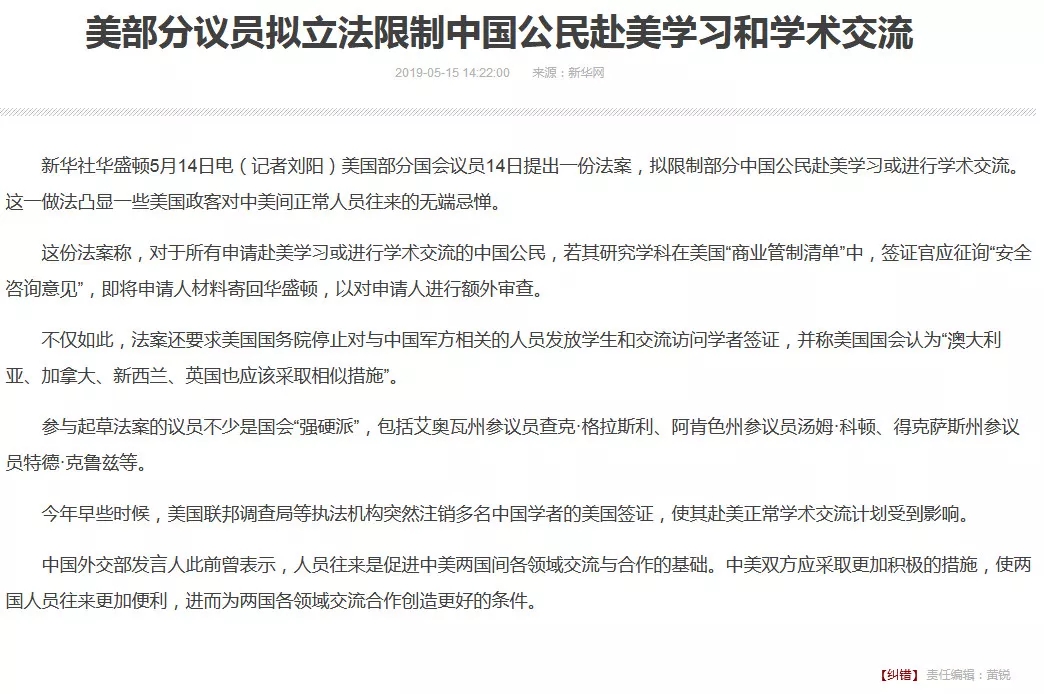 早在5月15日,美國部分國會議員于就曾提出壹項法案,拟限制部分中國公民赴美學習或進行學術交流。